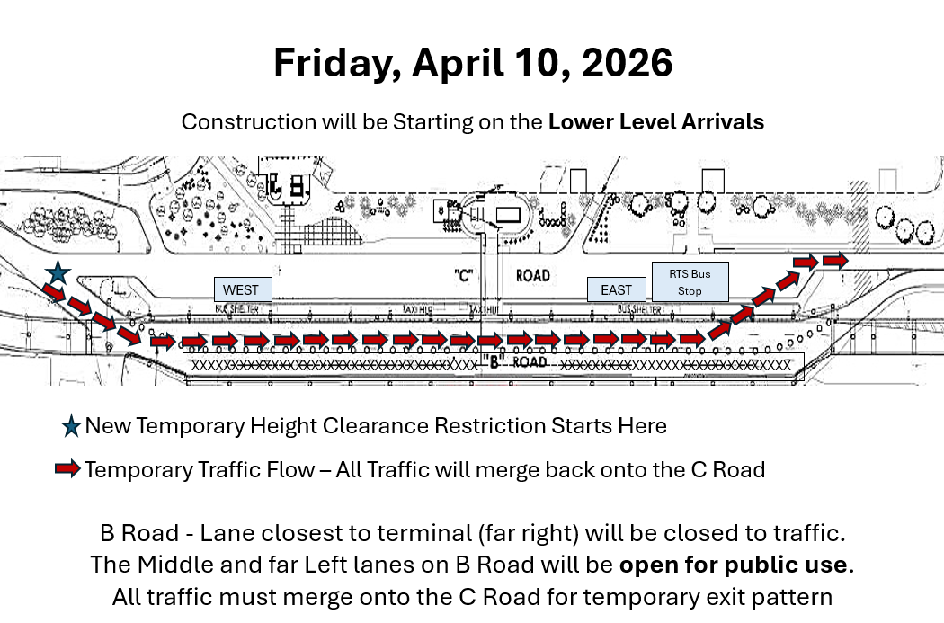 Construction is taking place at the Frederick Douglass Greater Rochester International Airport. The B Road, Lower-Level, Arrivals will be under construction for a few weeks.  All traffic will merge into C-Road traffic. Please refer to the map provided.